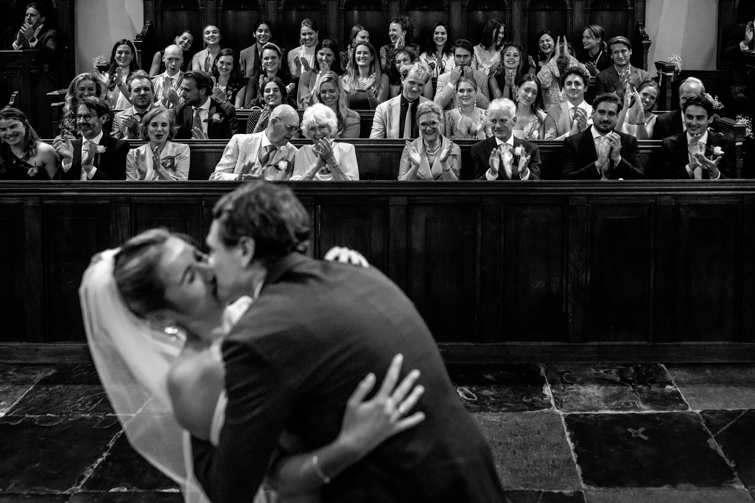 Het bruidspaar heeft elkaar het ja-woord gegeven en verzegelt dat met een hartstochtelijke kus, terwijl de gasten hen juichend aanmoedigen. Hun jongste zoon staat tussen hen in, een prachtige weergave van familie en liefde. De emoties, van blijheid en verbondenheid, zijn duidelijk voelbaar, zowel van het bruidspaar, als van hun gasten.