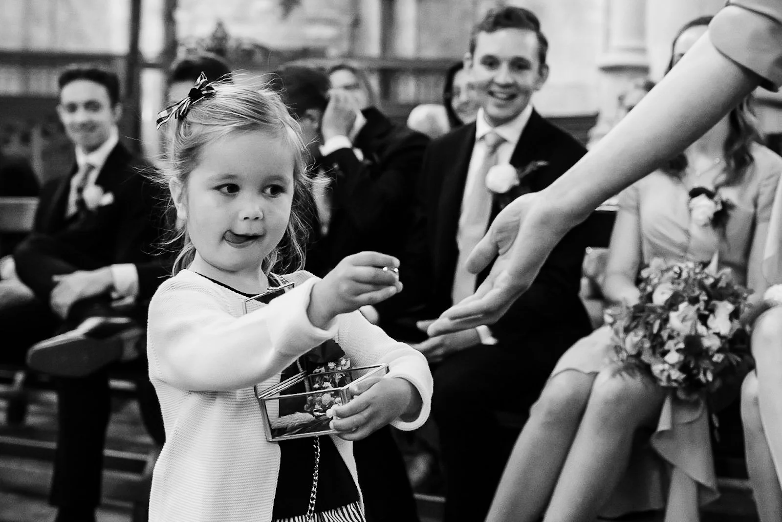 In een zee van volwassen gezichten stapt zij naar voren. De blik vastberaden, de tong nét uit haar mond – want dit is spannend. Ze draagt een ringendoosje alsof het een schatkist is. En eigenlijk is het dat ook.