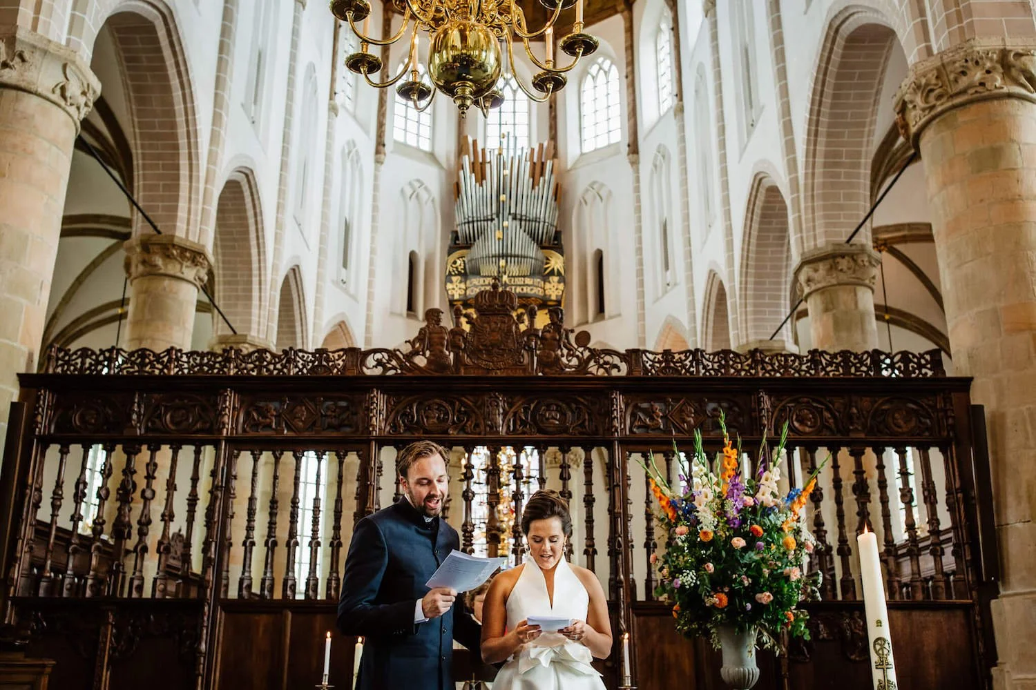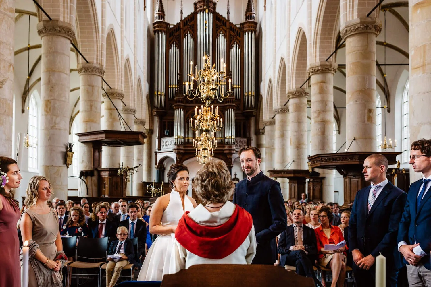 Nog los van die bijzondere connectie was het ook een erg toffe en goed doordachte dag: een mooie ceremonie in de Grote kerk in Naarden, zangeres Meike van der Veer die zong, een receptie in de prachtige tuin van Acquavite, een mooie taart van Sugarlips Cakes, een overheerlijk diner bij restaurant Faulk en een lief bruidspaar.